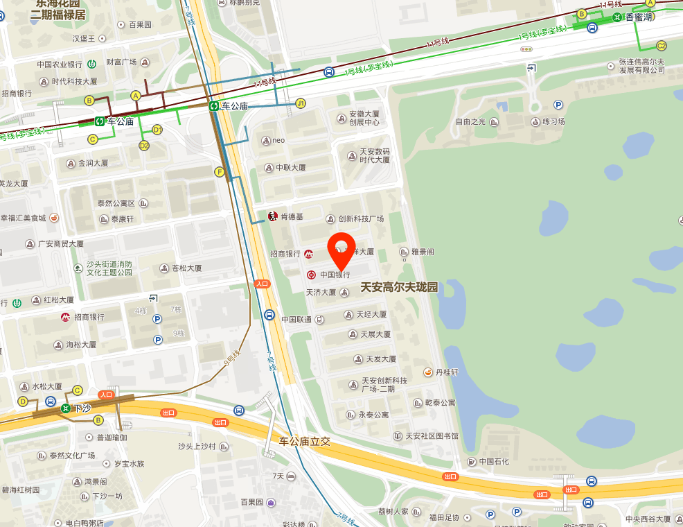 附近的地铁站: 距离地铁1、7、9、11号线的换乘站--车公庙站约590米 附近的公交站: 天安数码城 - 公交站241米; 途经公交车: 26路 63路 64路 71路 215路 303路 E12路 E1路 E37路 E6路 H220路 M102路 M169路 M500路 M555路 M559路 高快巴士14号 高快巴士16路 高快巴士70路 深南香蜜立交② - 公交站510米; 途经公交车: 101路 N6路 深南香蜜立交① - 公交站512米; 途经公交车: 21路 101路 113路 215路 222路 223路 324路 326路 328路 E38路 H220路 M191路 M213路 M392路 M413路 M447路 M447区间线 M448路 N4路 N6路 东站春运专线1号 高峰专线119路 高峰专线16号 高峰专线18路 高峰专线221号 高峰专线3号 高峰专线49路 高峰专线62路 高快巴士31路 高快巴士47号 高快巴士60号 上沙 - 公交站540米; 途经公交车: 34路 229路 337路 M182路 M463路 M559路 下沙① - 公交站588米; 途经公交车: 63路 236路 369路 E37路 E6路 M105路 M106路 M133路 M194路 福田欢乐购免费接驳专线1路 高快巴士14号 高快巴士16路 高快巴士70路 下沙① - 公交站610米; 途经公交车: 26路 63路 64路 322路 337路 339路 369路 E37路 E6路 M103路 M182路 M194路 M347路 M463路 M519路 M520路 福田欢乐购免费接驳专线1路 高快巴士14号 高快巴士16路